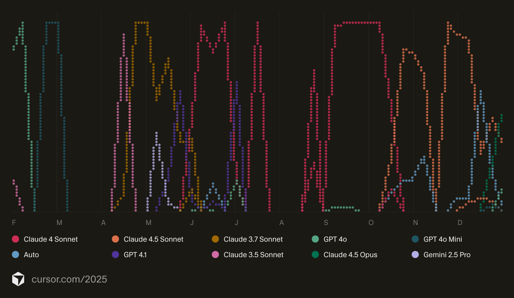 AI has changed my workflow as an engineer in the last 3 years. Instead of digging through Google results and Stackoverflow, I “chat” with Cursor and ChatGPT for coding problems, or directly assign tasks to AI coding agents. Below is a screenshot of my Cursor usage in 2025.