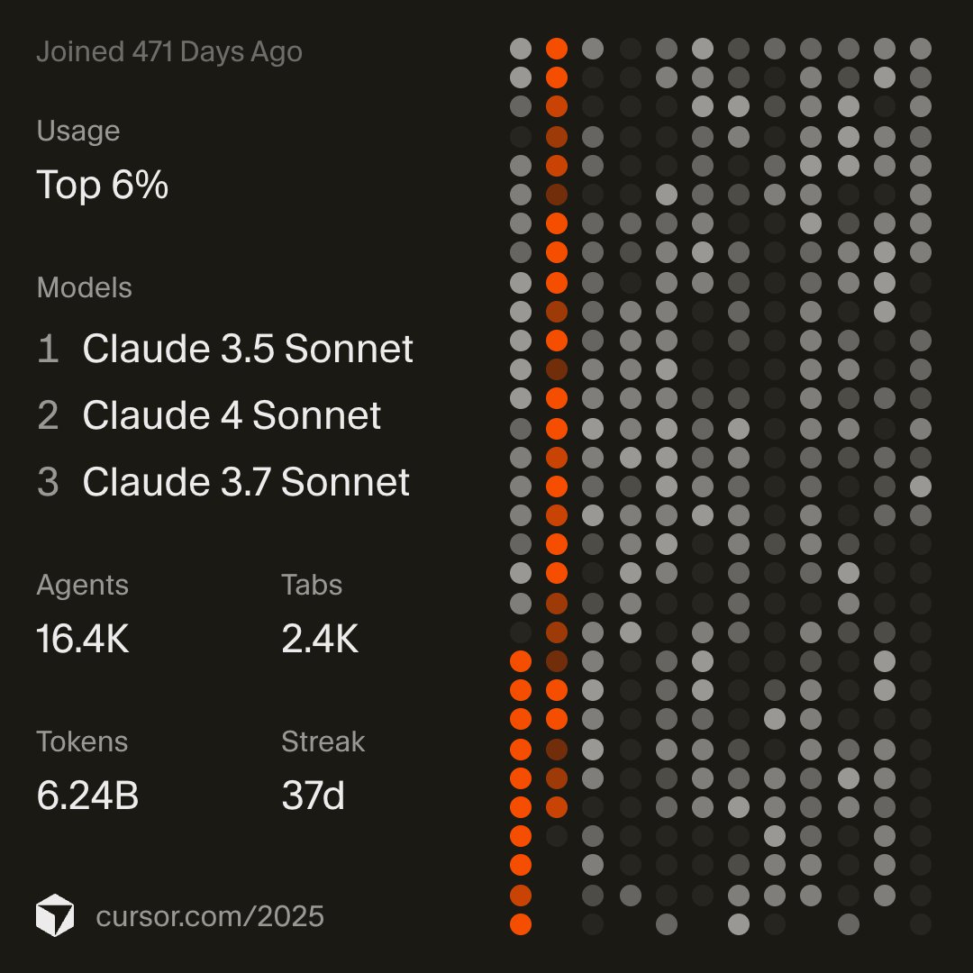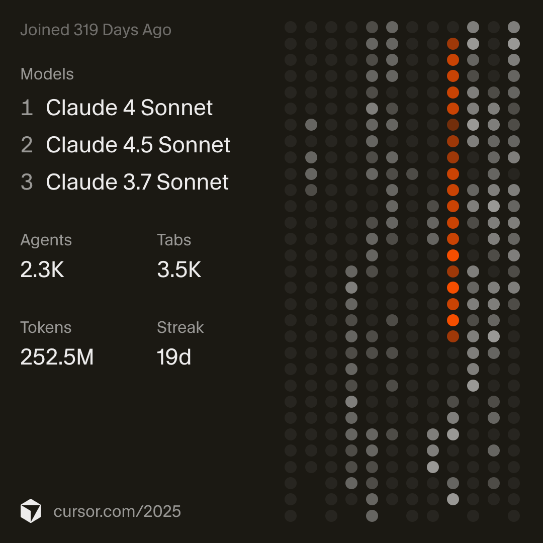 When I first read my Cursor 2025 report, I was pretty shocked that I’ve used 252 million tokens within a year. I proudly texted my friend: “I’m sure Cursor is losing money on me, and I’m a power user.” However, when I looked up the Cursor 2025 report on X, I realized the top 10% Cursor users generally consume more than 5 billion tokens in 2025. From a token consumption perspective, I might be an average user for Cursor.
